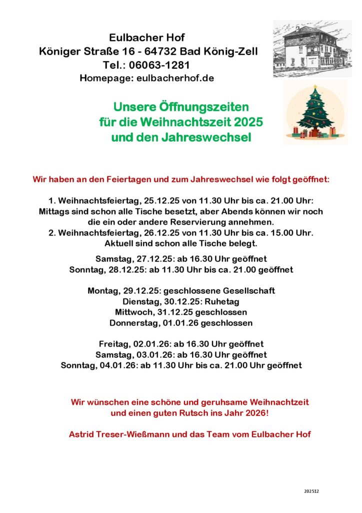 Nachfolgend noch unsere Öffnungszeiten für Weinachten und den Jahreswechsel!