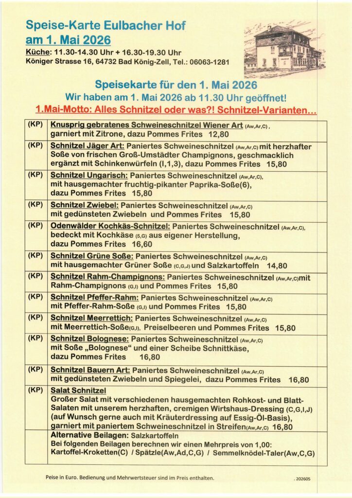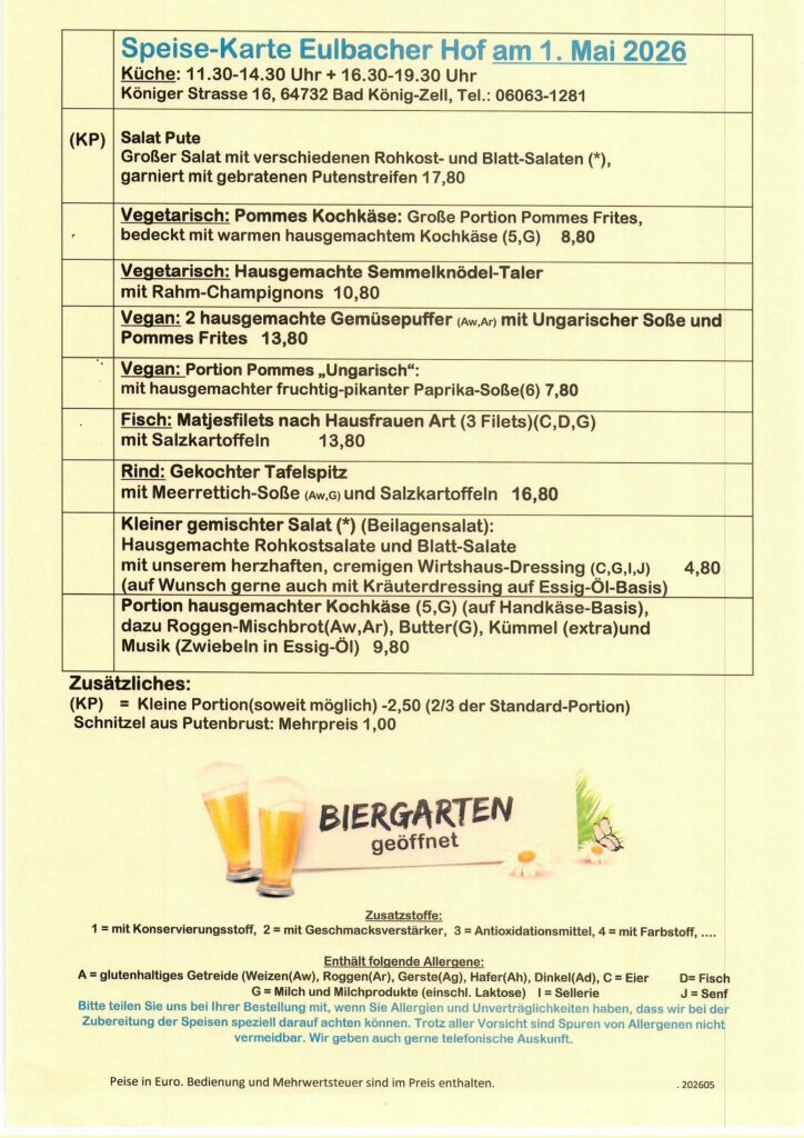 Es gibt ein kleines Programm mit Bieranstich und auch eine Drehorgel-Vorführung. Neben dem Angebot an Traditionellen Gerichten aus der Odenwälder Küche wird es auch das ein oder andere Getränk zum Sonderpreis geben. Bei schönen Wetter begehen wir dieses Jubiläum im Eulen-Biergarten. Eine Reservierung wäre wünschens- und empfehlungswert. Wir freuen uns auf Euch! Astrid und das Team vom Eulbacher Hof